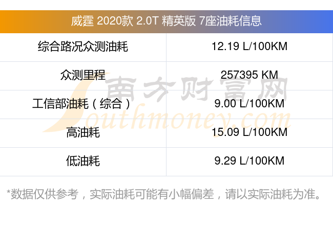 根据车主实测数据,该车型低油耗为9.29升/百公里,高油耗为15.09升/百公里,综合路况众测油耗为12.19升/百公里,工信部综合油耗为9.00升/百公里。