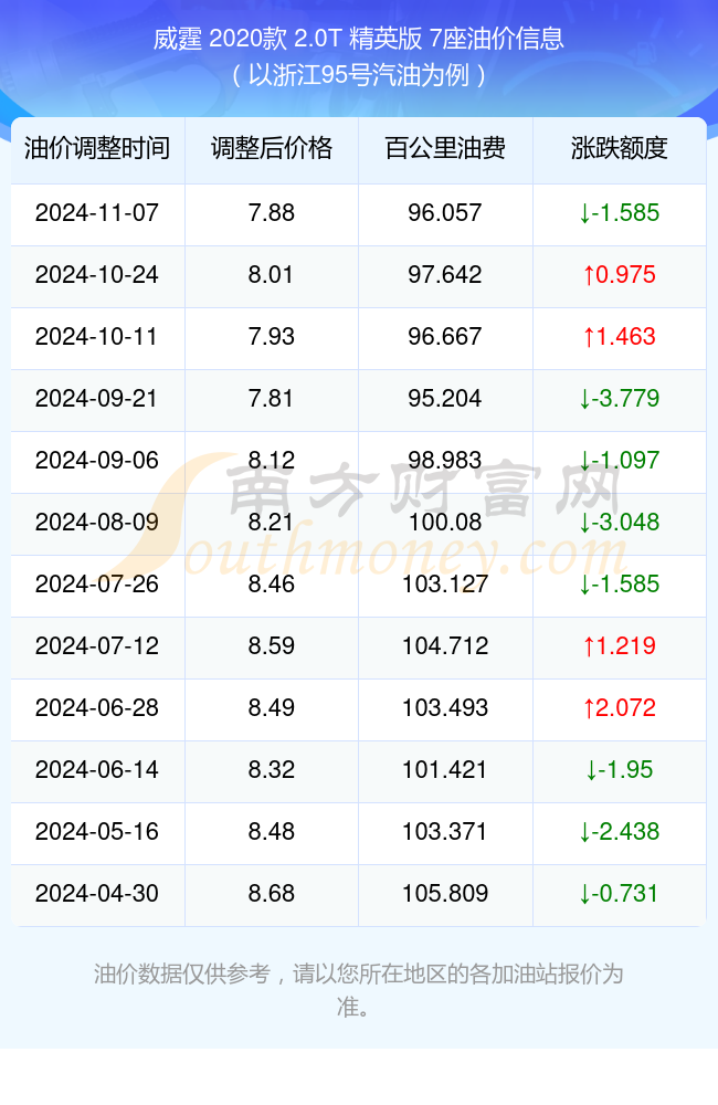 依照11月7日95号汽油最新调整价格7.88元/升来计算(以浙江为例),该车型百公里的平均油费是96.057元,依照上一轮10月24日调整价格8.01元/升来计算,百公里的平均油费是97.642元,对比上一轮少花1.585元,下一轮的油价调整时间12月2日24时。