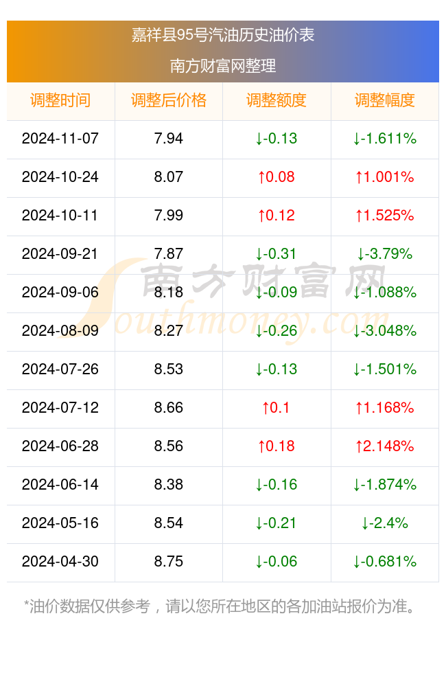 嘉祥县95号汽油历史油价表