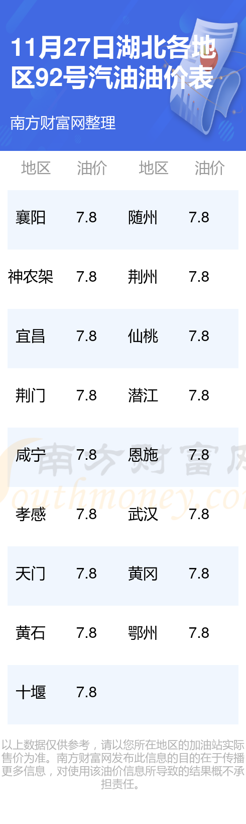 11月27日湖北92号汽油的价格是11月7日调整后的价格,为7.45元/升,对比上次调整共下跌了0.12元,下跌1.585%。