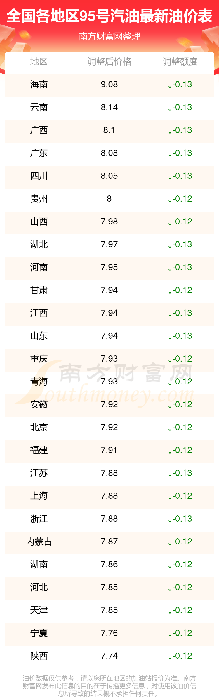 11月27日全国95号汽油最新平均价格为8元每升,本次油价格调整时间为11月7日,其中,全国95号汽油最低为陕西,价格7.74元/升,95号汽油最高为海南,价格9.08元/升。