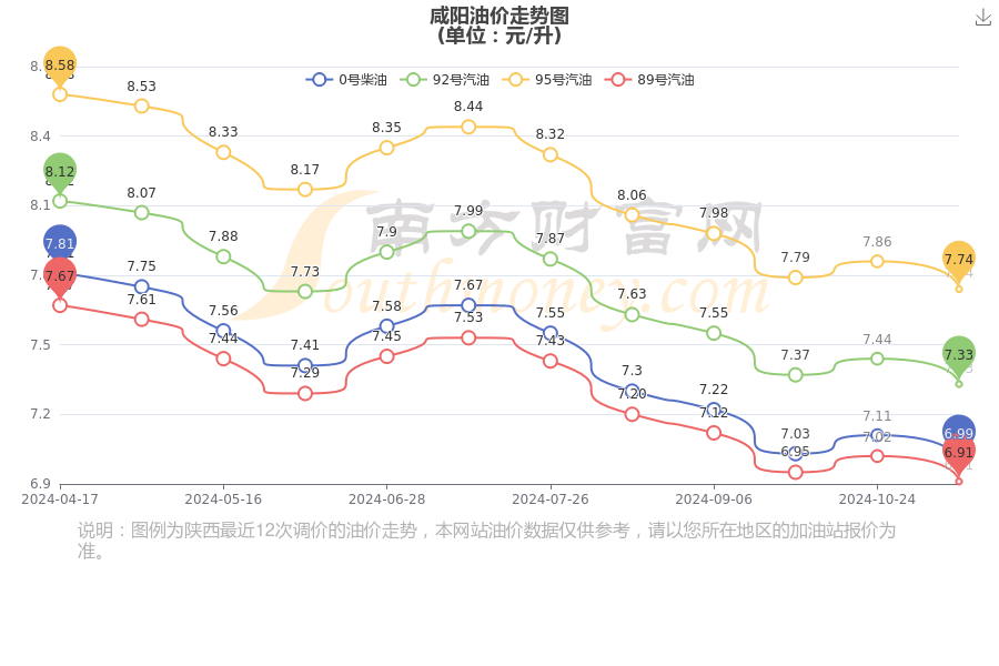 以上油价信息是当前市场上最新油价信息,油价数据仅供参考,实际在售油价可能有小幅偏差,请以您所在地区的加油站实际售价为准。