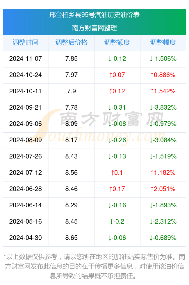 邢台柏乡县95号汽油历史油价表