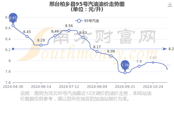邢台柏乡县95号汽油11月27日的价格为11月7日调整后的价格,具体为7.85元/升,相对上次调整下降了0.12元。