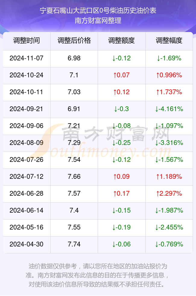 11月27日,宁夏石嘴山大武口区0号柴油今日价格(调整时间为11月7日):6.98元每升,对比上次调整(10月24日)的油价7.1元每升,共下跌了0.12元,下跌幅达1.69%。