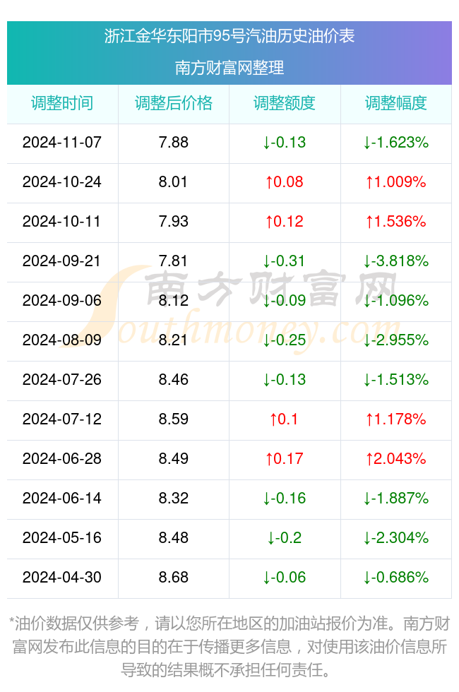 11月27日浙江金华东阳市95号汽油的价格是11月7日调整后的价格,具体为7.88元/升,对比上次调整时间10月24日的油价8.01元每升,下调了0.13元,下调幅达1.623%。