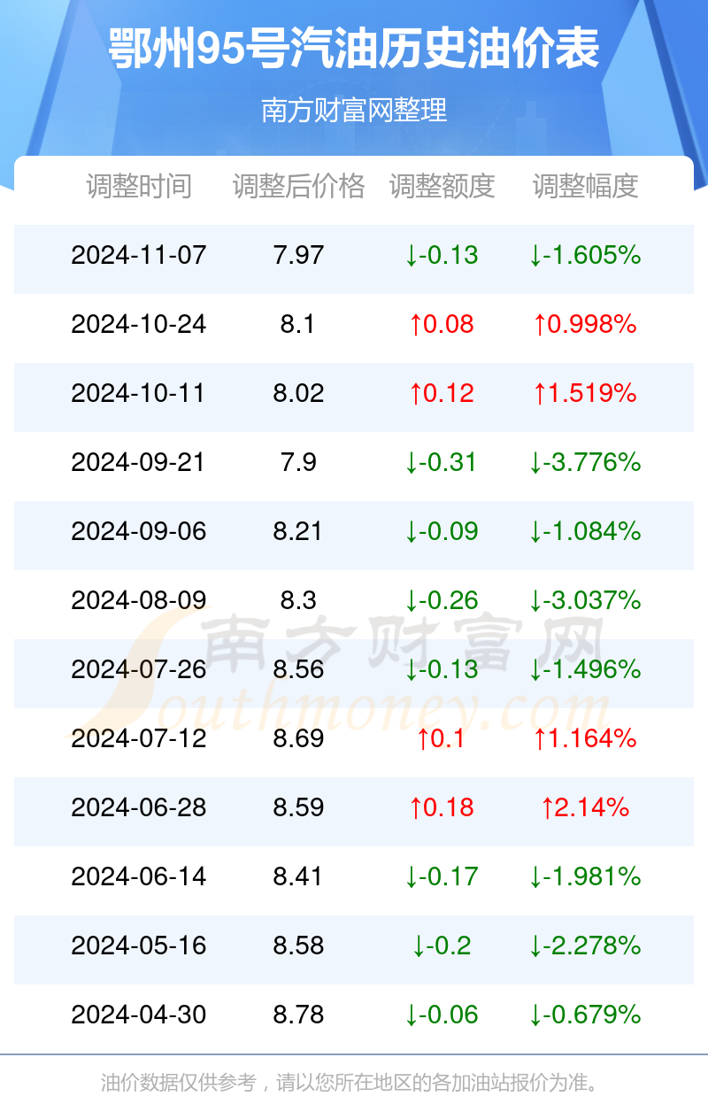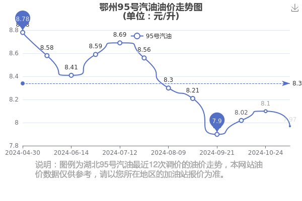 11月27日鄂州95号汽油价格查询:每升7.97元(11月7日油价调整后的价格),相对上次调整时间10月24日的油价8.1元每升,下降了0.13元,下降1.605%。