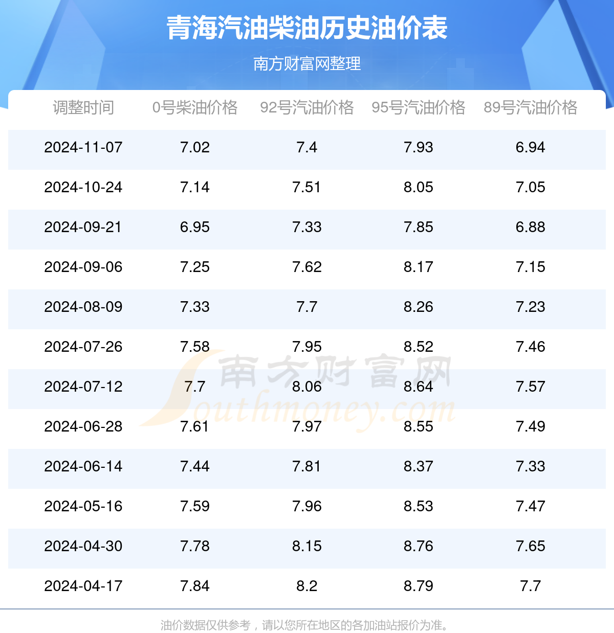 青海汽油、柴油11月28日每升最新价格查询:本轮油价调整时间为11月7日,92号汽油7.4元,下调了0.11元;95号汽油7.93元,下调了0.12元;89号汽油6.94元,下调了0.11;0号柴油7.02元,下调了0.12元。