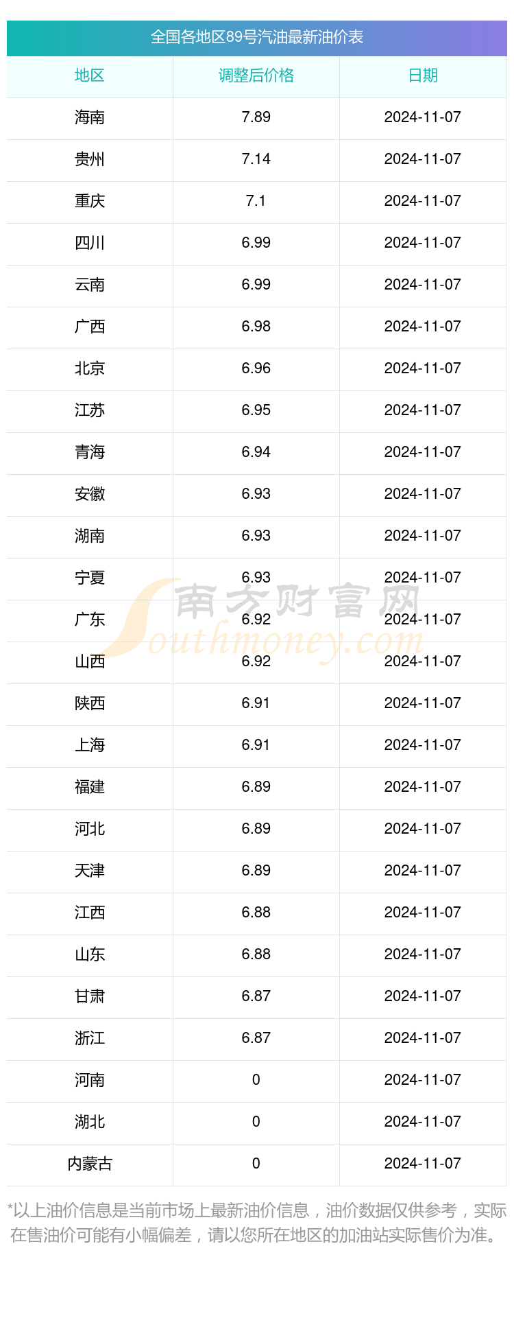 11月28日全国89号汽油每升的价格:调整时间为11月7日,平均价格为7元/升,最低的是浙江,价格6.87元/升,最高的是海南,价格7.89元/升。