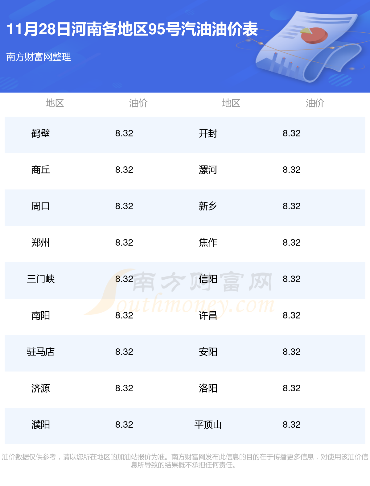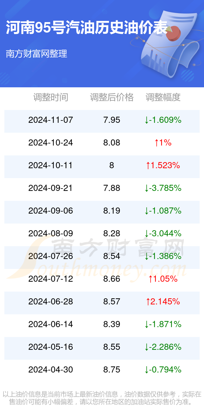 11月28日,河南95号汽油的最新价格为7.95元/升,油价调整时间是11月7日,对比上一轮调整共减了0.13元,减1.609%。