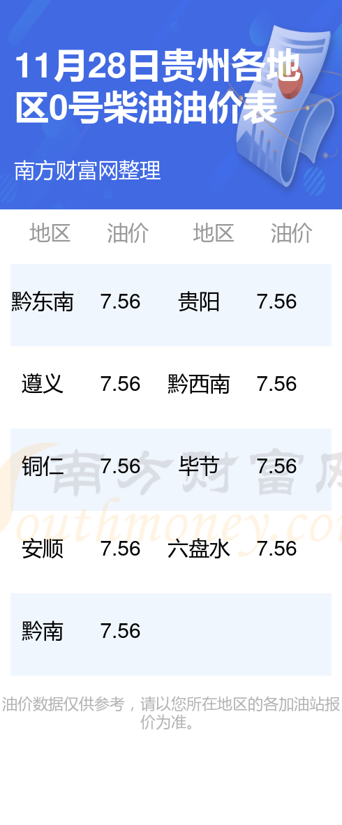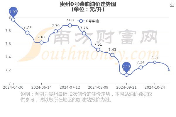 11月28日贵州0号柴油价格为7.2元/升,调整时间为11月7日,相对上次调整时间10月24日的油价7.32元/升,跌了0.12元。