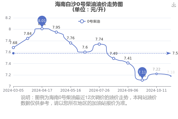 海南白沙0号柴油11月28日价格(11月7日调整后的价格):7.18元每升,对比上次调整(10月11日)的价格7.3元每升下跌了0.12元,下跌幅达1.644%。