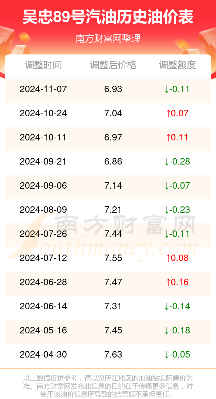 11月28日吴忠89号汽油的价格为6.93元每升,本次调整时间为11月7日,相对上次调整时间10月24日的油价7.04元每升,下降了0.11元,下降幅达1.563%。