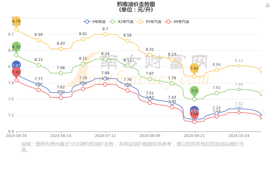11月28日,黔南汽油、柴油每升最新价格为(11月7日调整后的价格):92号汽油为7.57元,下跌了0.11元,下跌幅达1.43%;95号汽油为8元,下跌了0.12元,下跌幅达1.48%;89号汽油为7.14元,下跌了0.11元,下跌幅达1.52%;0号柴油为7.2元,下跌了0.12元,下跌幅达1.64%。
