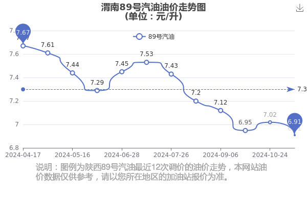 11月28日,渭南89号汽油最新价格为:6.91元每升,调整时间为11月7日,相对上次调整时间10月24日的油价7.02元每升,降了0.11元,降幅达1.567%。