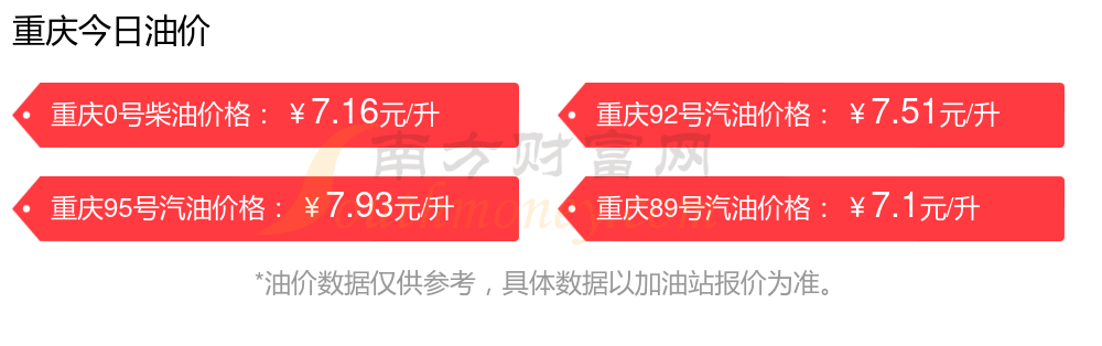 11月28日,重庆汽油、柴油的价格为11月7日调整后的价格。具体为:92号汽油7.51元,跌了0.11元;95号汽油7.93元,跌了0.12元;89号汽油7.1元,跌了0.11;0号柴油7.16元,跌了0.12元。