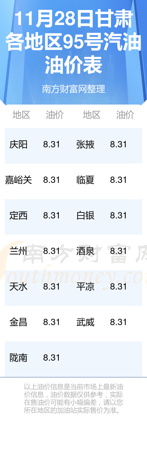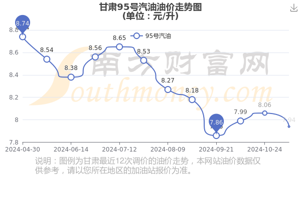 11月28日,甘肃95号汽油的价格是7.94元每升,本次的调整时间为11月7日,对比上次的调整下降了0.12元,下降1.489%,下次调整时间为12月2日24时,还有5天。