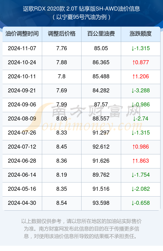根据11月7日95号汽油最新调整价格7.76元/升来计算(以宁夏为例),该车型每百公里的平均油费是85.05元,上一轮10月24日调整价格7.88元每升来计算,每百公里的平均油费是86.365元,对比上一轮少花1.315元,下一轮的油价调整时间是12月2日24时。