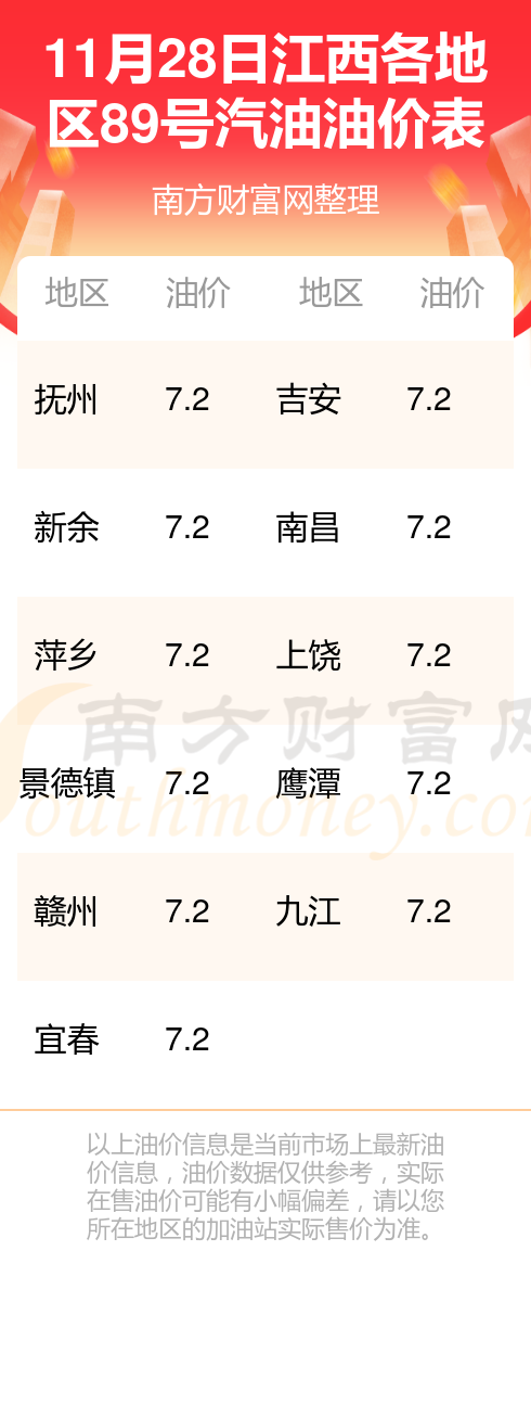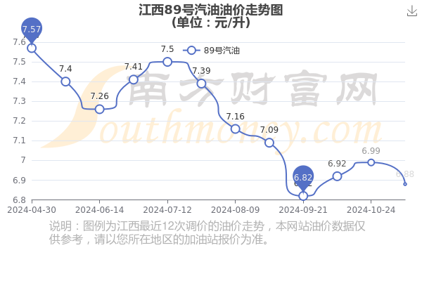 11月28日,江西89号汽油最新油价是6.88元每升,本轮调整时间为11月7日,相对上轮调整时间10月24日的油价6.99元/升,跌了0.11元。