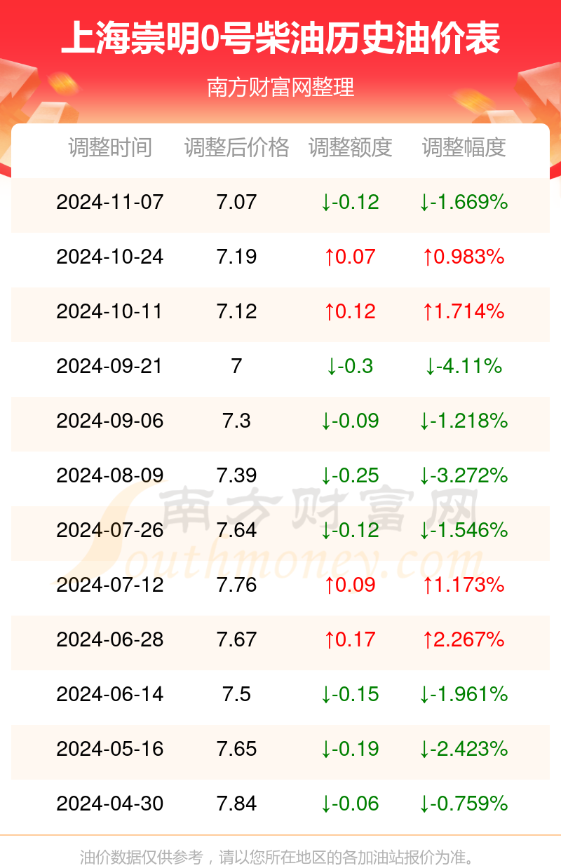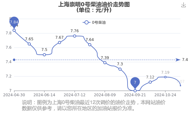 上海崇明0号柴油11月28日最新价格为11月7日油价调整后的价格,具体为7.07元/升,相对上次调整时间10月24日的油价7.19元每升,共下降了0.12元,下降1.669%。