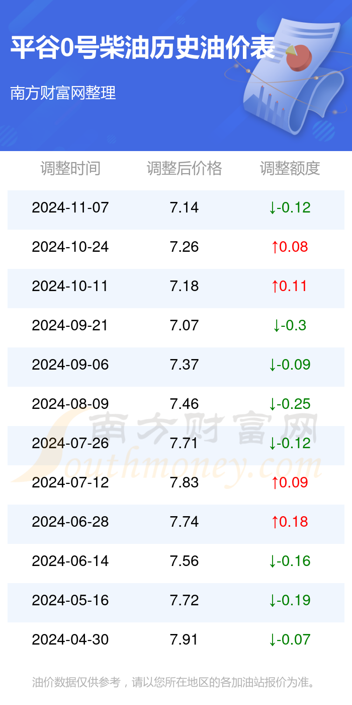 11月28日平谷0号柴油的价格为7.14元/升,这是11月7日调整后的价格,相对上次调整时间10月24日的油价7.26元每升,减了0.12元,减幅达1.653%。