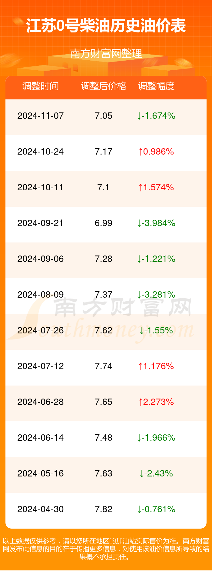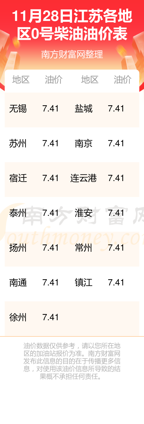 江苏0号柴油11月28日最新价格是7.05元每升,本轮油价调整时间是11月7日,对比上次共减了0.12元,减1.674%。