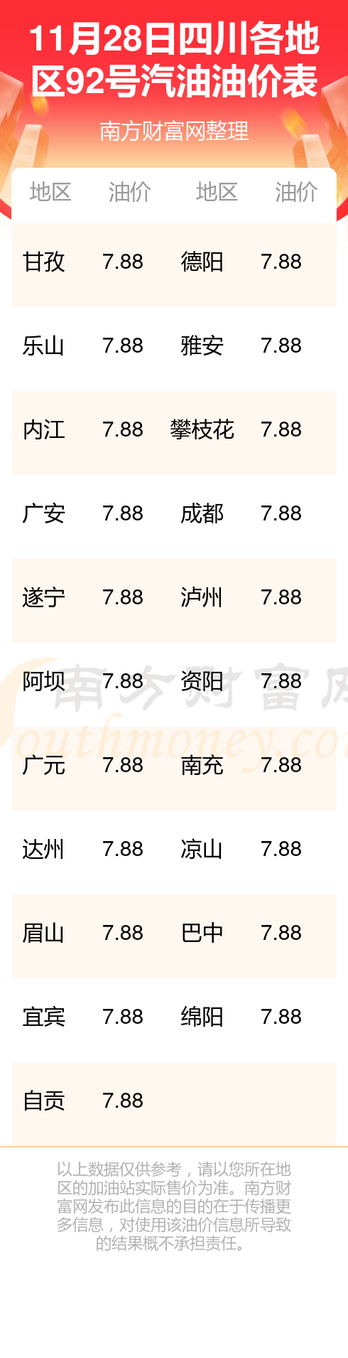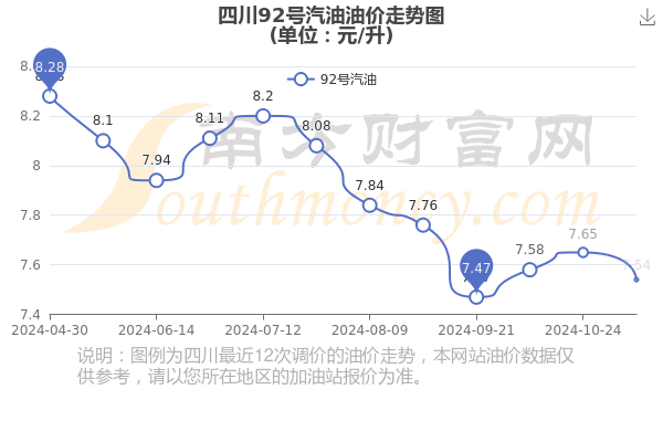 11月28日四川92号汽油最新油价是7.54元/升,这是11月7日调整后的价格,对比上次调整减了0.11元,减1.438%。