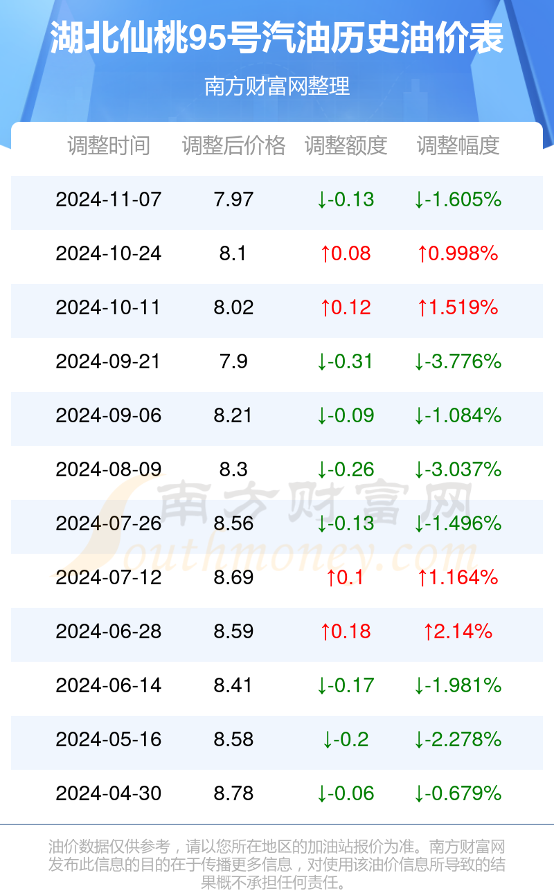 湖北仙桃95号汽油历史油价表