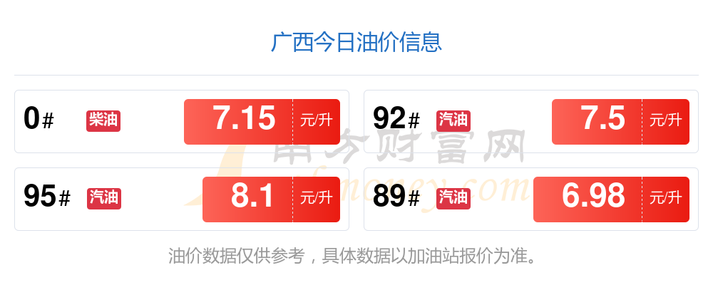 广西汽油、柴油11月28日每升最新价格为:92号汽油为7.5元;95号汽油为8.1元;89号汽油为6.98元,下降了0.11;0号柴油为7.15元,调整时间为11月7日。