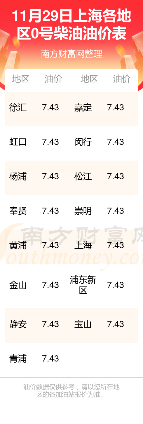 上海各地区最新0号柴油油价表