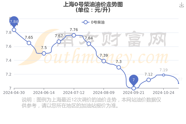11月29日上海0号柴油的价格是11月7日调整后的价格,为7.07元/升,10月24日为上一轮油价调整时间,上次调整后上海0号柴油价格为7.19元/升,本次相比下跌了0.12元,下跌幅为1.669%。