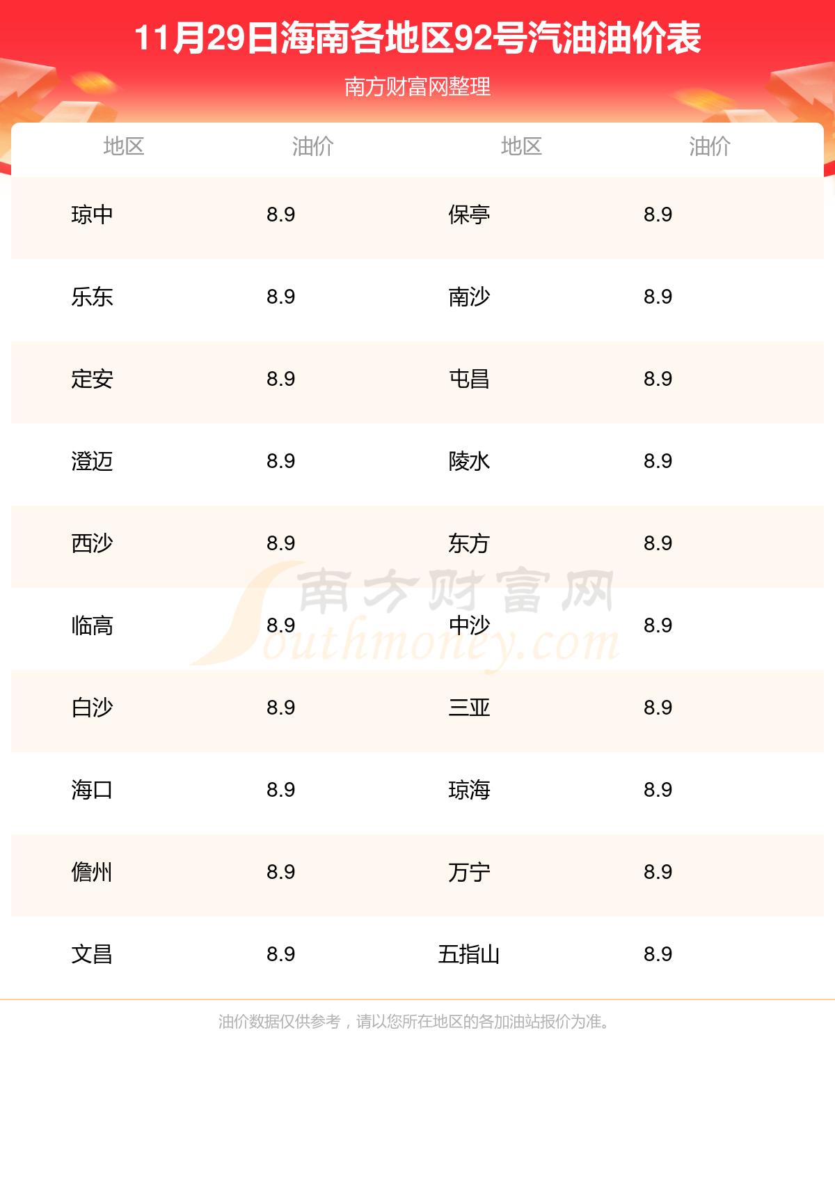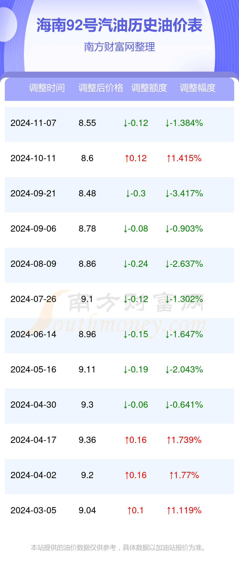 海南92号汽油11月29日价格为8.55元/升,调整时间为11月7日,相对上次调整降了0.12元,降1.384%。