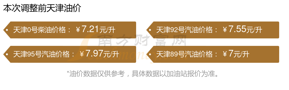 11月29日天津汽油、柴油的价格多少钱一升?本轮油价调整时间是11月7日,92号汽油7.43元,下跌了0.12元,下跌幅达1.59%;95号汽油7.85元,下跌了0.12元,下跌幅达1.51%;89号汽油6.89元,下跌了0.11元,下跌幅达1.57%;0号柴油7.09元,下跌了0.12元,下跌幅达1.66%。