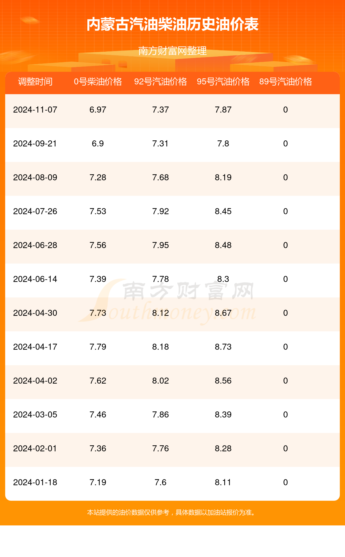 内蒙古汽油、柴油11月29日每升最新价格查询:本轮油价调整时间为11月7日,92号汽油7.37元,下调了0.12元;95号汽油7.87元,下调了0.12元;0号柴油6.97元,下调了0.12元。