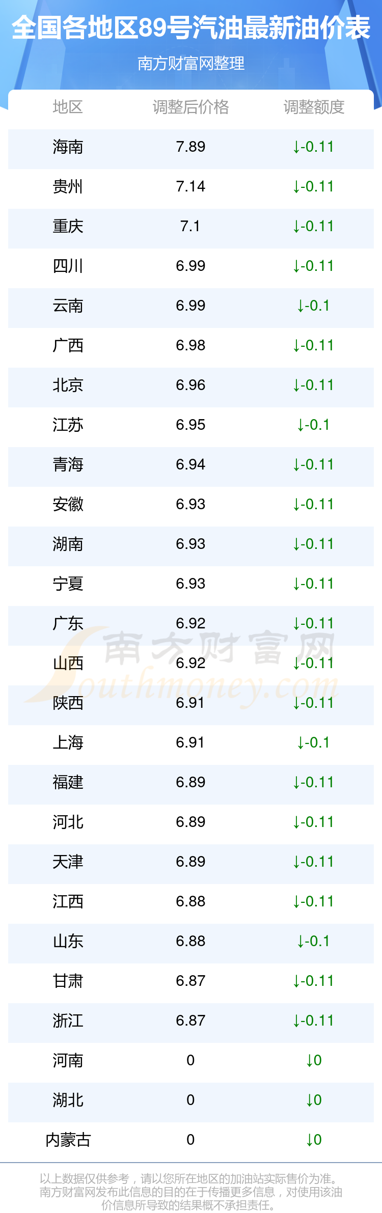 11月29日,全国89号汽油最新平均价格为:7元每升,调整时间为11月7日,其中,89号汽油最高为海南,价格为7.89元/升,全国89号汽油最低为浙江,价格为6.87元/升。