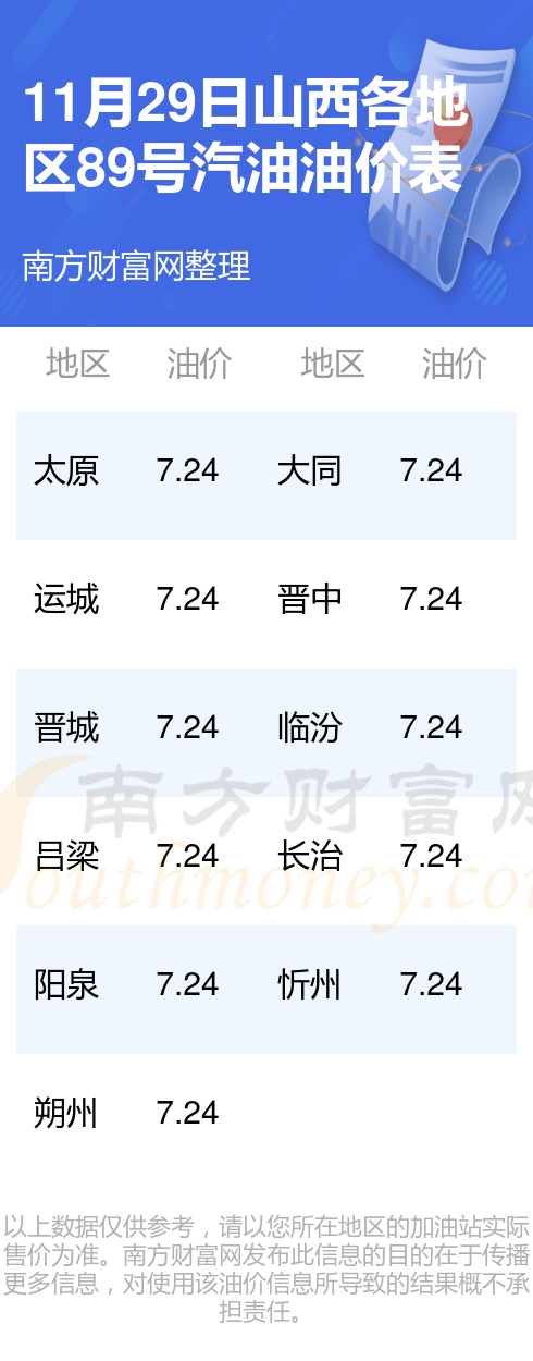 山西各地区最新89号汽油油价表