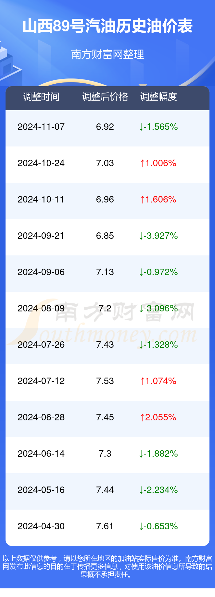 11月29日山西89号汽油的价格为6.92元每升,这是11月7日调整后的时间,相对上一轮调整共跌了0.11元。