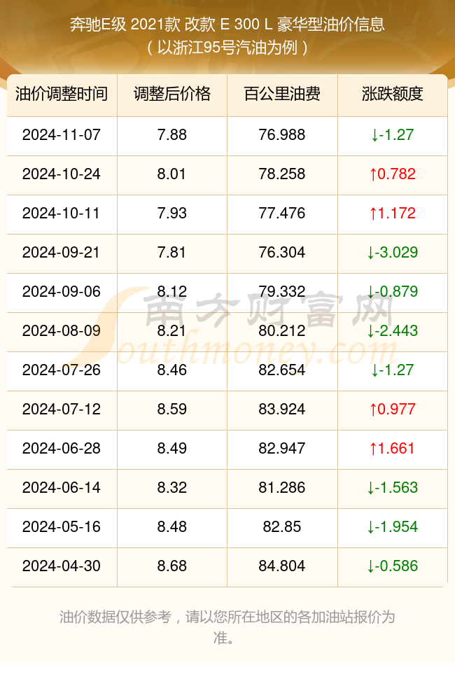 按11月7日95号汽油最新调整价格7.88元每升来计算(以浙江为例),该车型百公里平均油费为76.988元,按上一轮10月24日调整价格8.01元每升来计算,百公里平均油费为78.258元,对比上一轮少花1.27元,下一轮油价调整时间为12月2日24时。