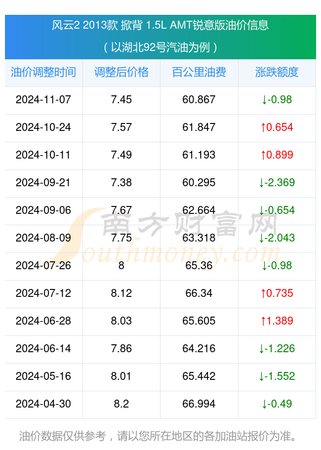 根据11月7日92号汽油最新调整价格7.45元/升来计算(以湖北为例),该车型每百公里的平均油费是60.867元,上一轮10月24日调整价格7.57元每升来计算,每百公里的平均油费是61.847元,对比上一轮少花0.98元,下一轮的油价调整时间是12月2日24时。