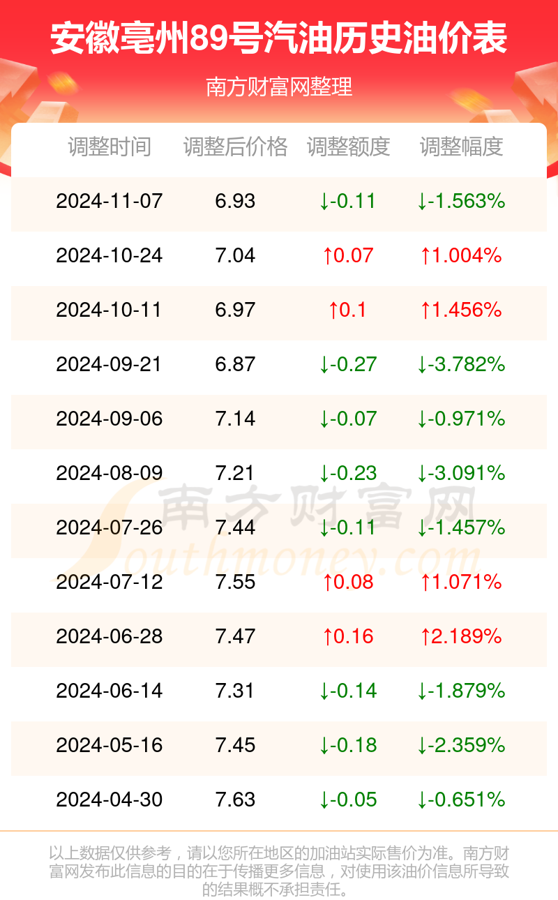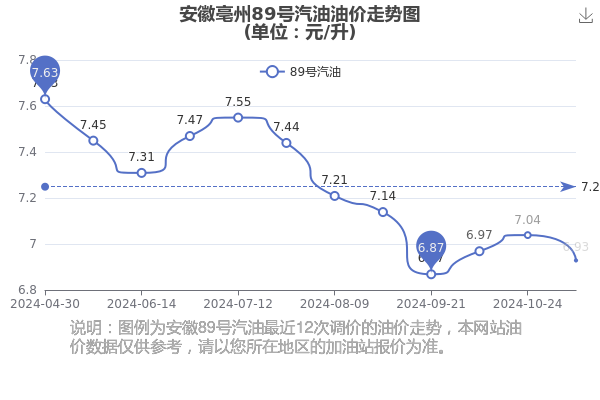 12月2日安徽亳州89号汽油的价格是6.93元/升(油价调整时间11月7日),相对上一轮油价调整时间10月24日的价格7.04元/升,减了0.11元,减幅达1.563%。