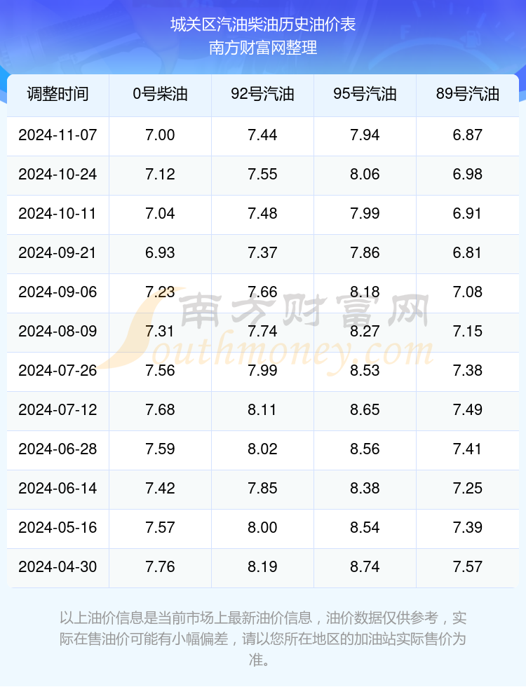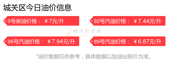 城关区汽油、柴油12月2日每升最新价格:92号汽油为7.44元;95号汽油为7.94元;89号汽油为6.87元;0号柴油为7元,本轮油价调整时间为11月7日。