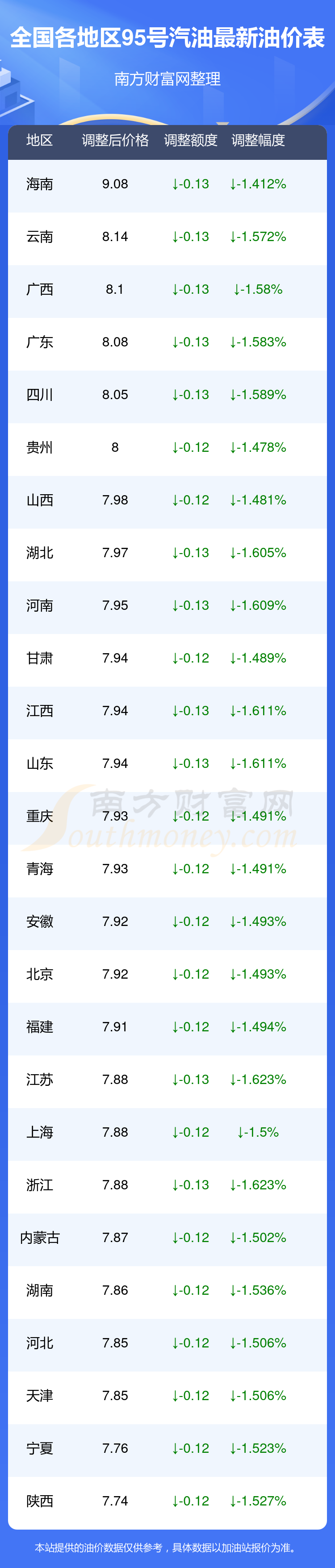 全国各地区最新95号汽油油价表