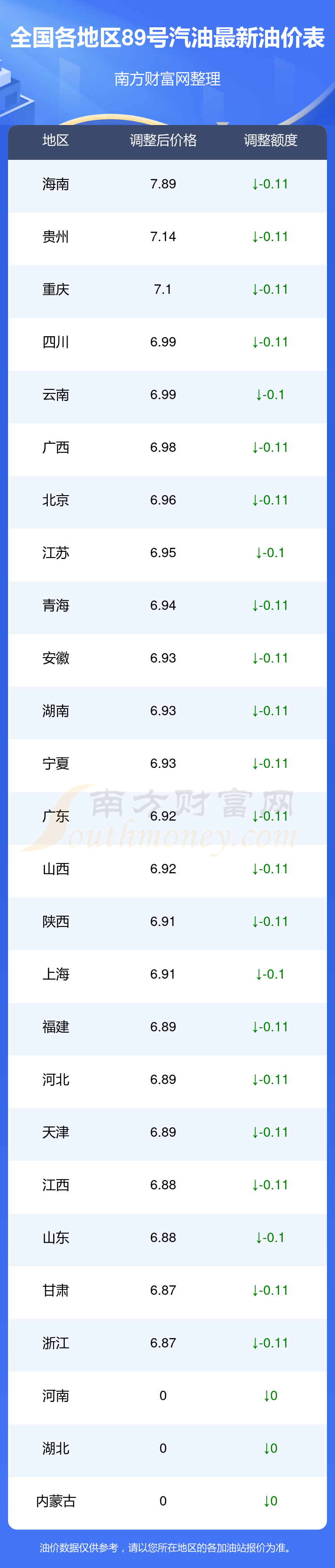 全国89号汽油12月2日的最新价格是11月7日油价调整后的价格,当中,平均价格为7元/升,最低的是浙江,价格6.87元/升,最高的是海南,价格7.89元/升。