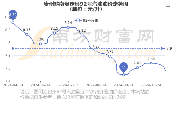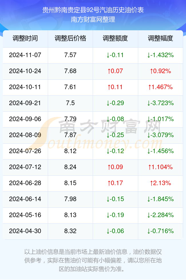 贵州黔南贵定县92号汽油12月3日的价格为每升7.57元,本次油价的调整时间11月7日,对比上次油价调整时间10月24日的价格7.68元/升,共减了0.11元,减幅达1.432%。