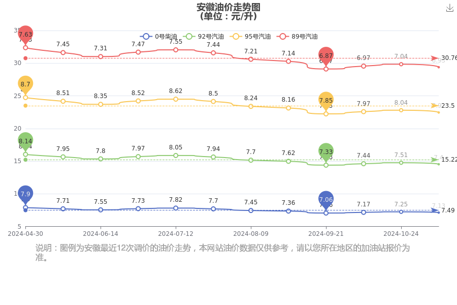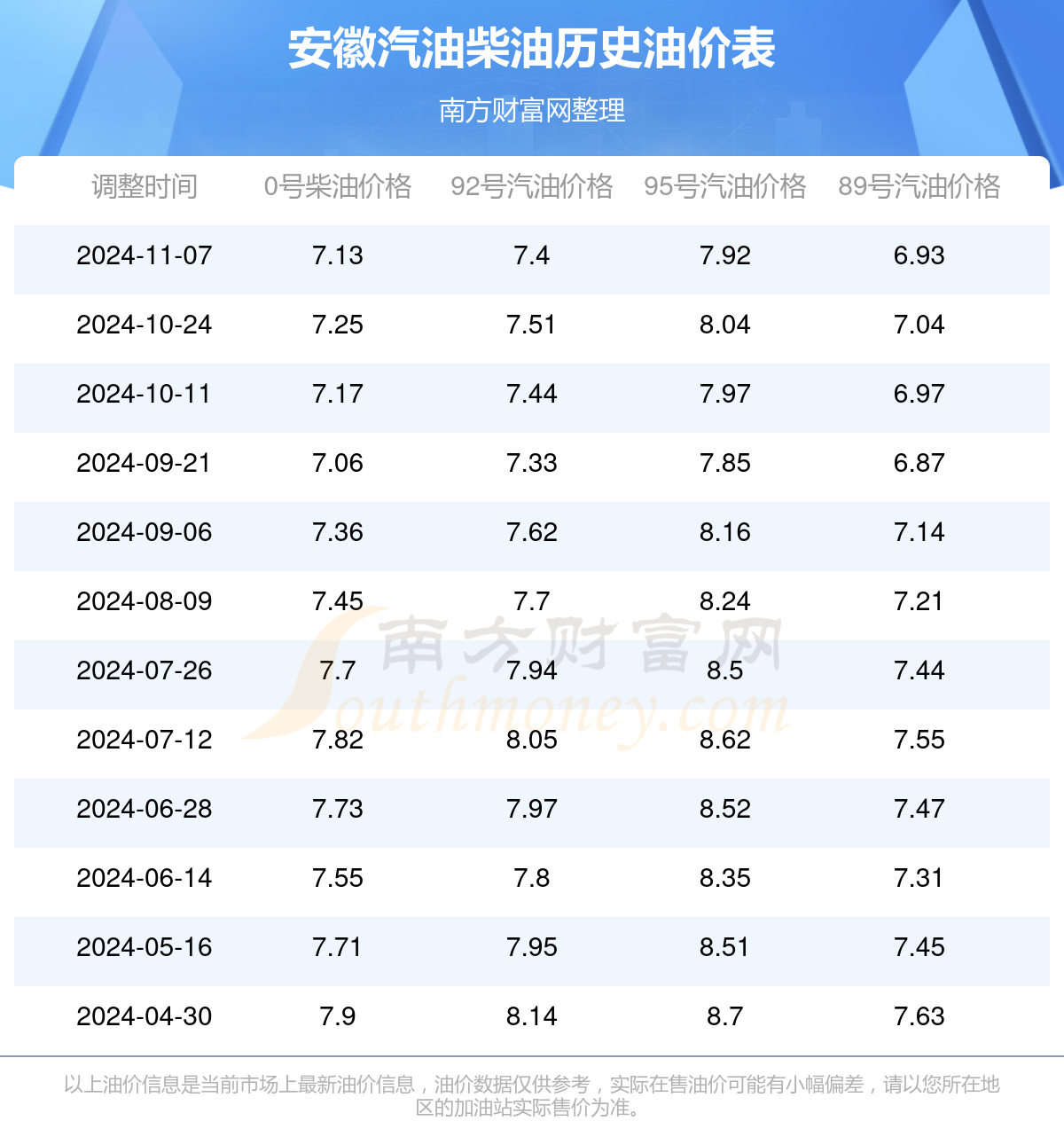 12月28日,安徽汽油、柴油每升最新价格为:92号汽油为7.4元,下调了0.11元;95号汽油为7.92元,下调了0.12元;89号汽油为6.93元,下调了0.11;0号柴油为7.13元,下调了0.12元,调整时间为11月7日。