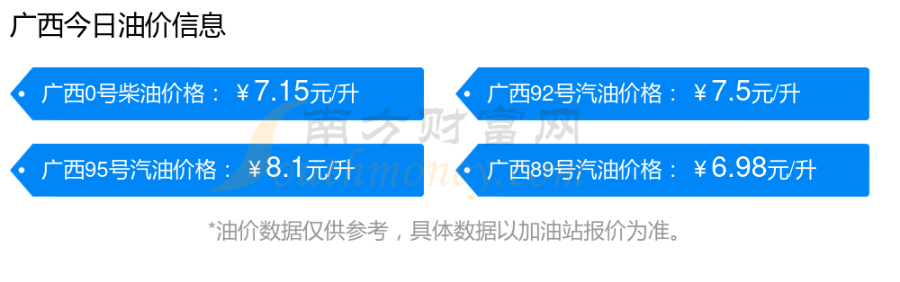 广西汽油、柴油12月28日每升最新价格多少钱一升?本次油价调整时间为11月7日,92号汽油为7.5元,跌了0.11元;95号汽油为8.1元,跌了0.13元;89号汽油为6.98元,跌了0.11;0号柴油为7.15元,跌了0.12元。