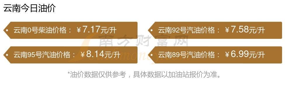 云南汽油、柴油12月28日每升最新价格为11月7日调整后的价格,92号汽油为7.58元,降了0.12元;95号汽油为8.14元,降了0.13元;89号汽油为6.99元,降了0.1;0号柴油为7.17元,降了0.11元。