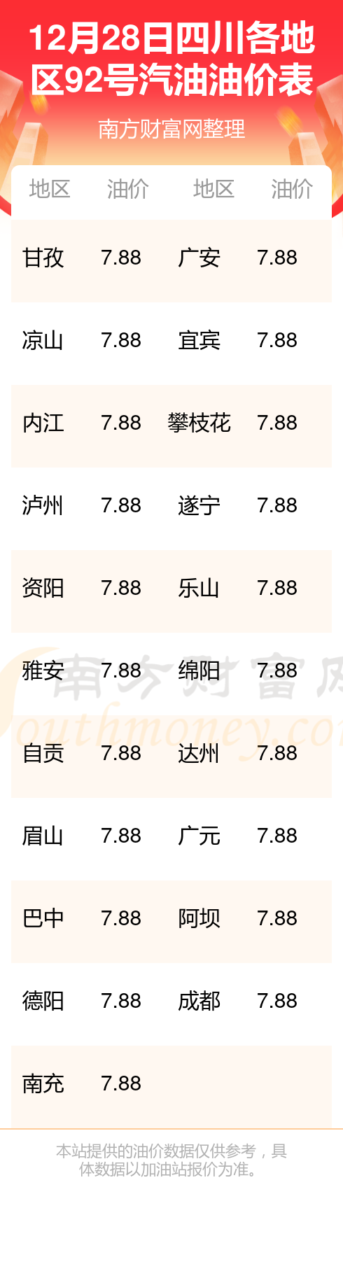 12月28日四川92号汽油价格是11月7日调整后的价格,具体价格是7.54元每升,相对上轮调整时间10月24日的油价7.65元/升,共跌了0.11元。