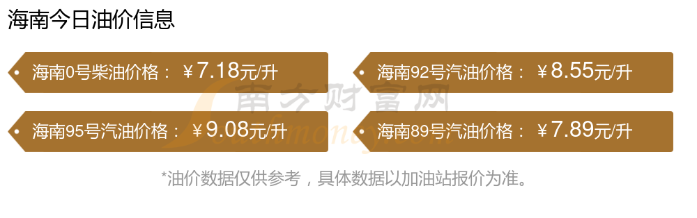 12月28日,海南汽油、柴油每升最新价格为:92号汽油为8.55元,下跌了0.12元;95号汽油为9.08元,下跌了0.13元;89号汽油为7.89元,下跌了0.11;0号柴油为7.18元,下跌了0.12元,调整时间为11月7日。