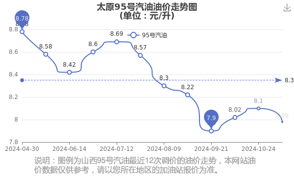 太原95号汽油12月28日的最新价格(11月7日油价调整后的价格):太原95号汽油7.98元/升,相对上次调整时间10月24日的油价8.1元每升,减了0.12元,减1.481%。